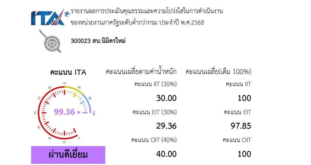 สถานีตำรวจนครบาลนิมิตรใหม่ มีผลการประเมิน ITA ปี พ.ศ. 2568 อยู่ในระดับ “ผ่านดีเยี่ยม” หน่วยงานสามารถรักษาระดับผลการประเมิน ITA ปี พ.ศ. 2569 ให้อยู่ในระดับ “ผ่านดีเยี่ยม” ให้ได้